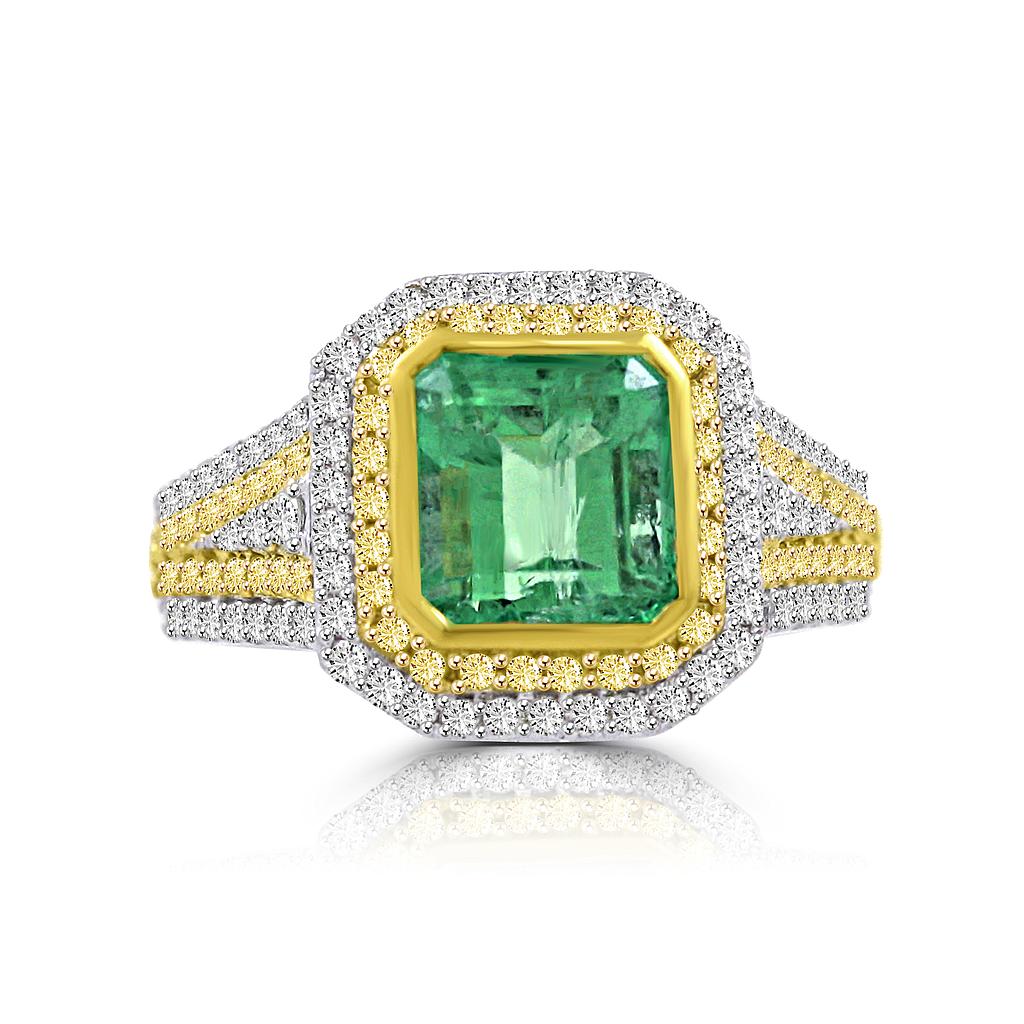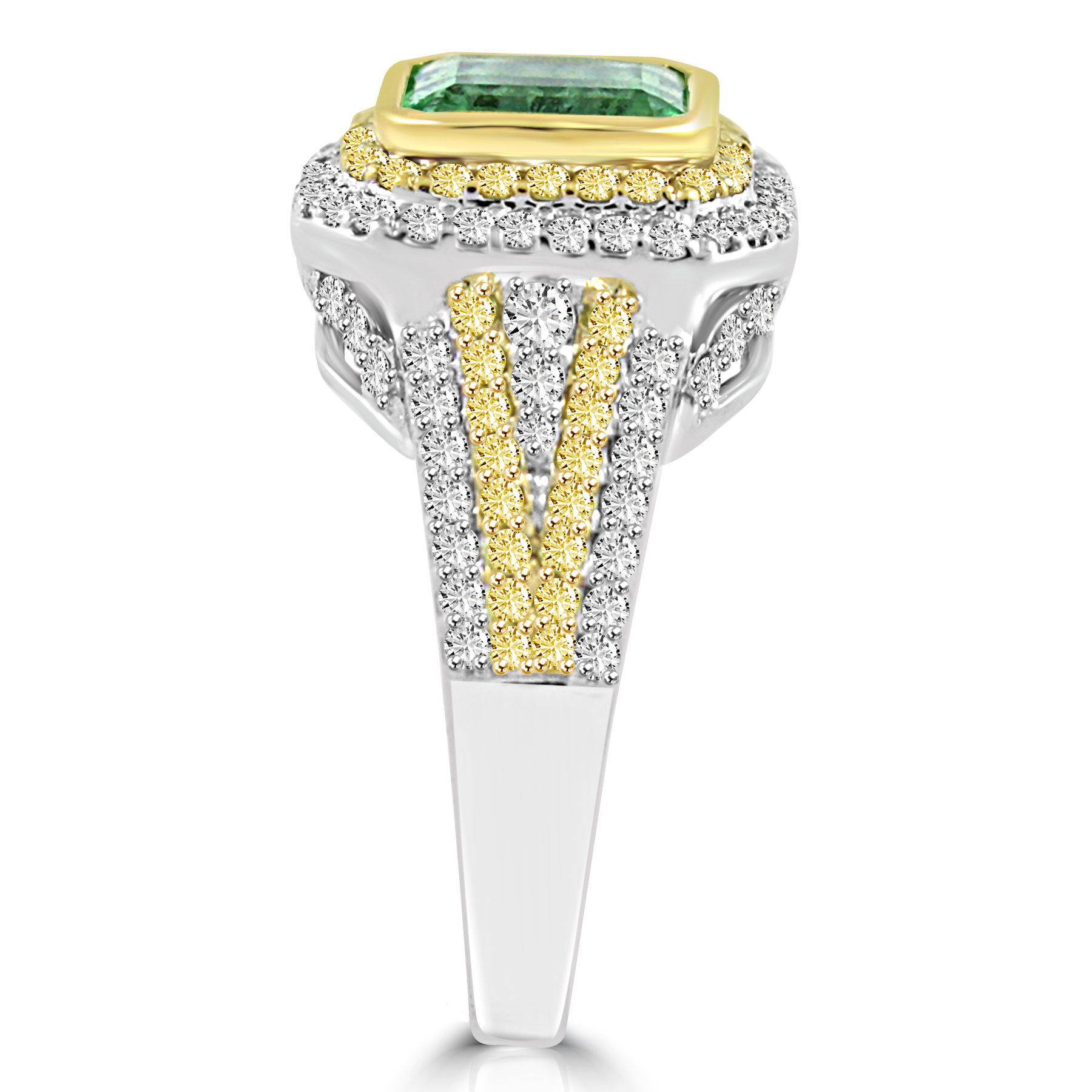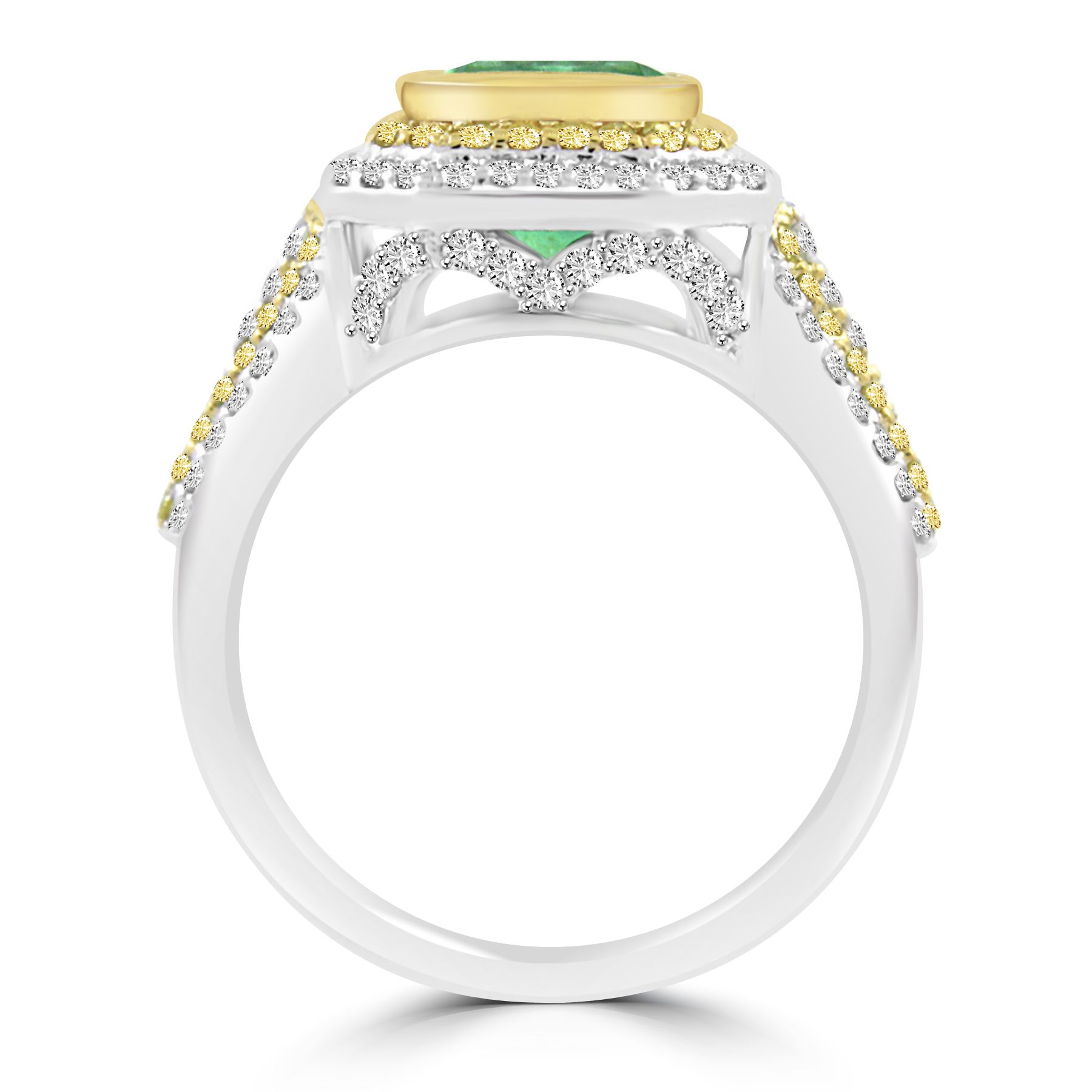 1.98ct. Emerald with a halo of Natural Yellow and White Diamonds, Ring set in 18K Gold