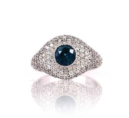 1.30 carat natural blue zircon ring surrounded with pave set white diamond melees 1.50 cts set in 18 karat gold