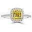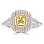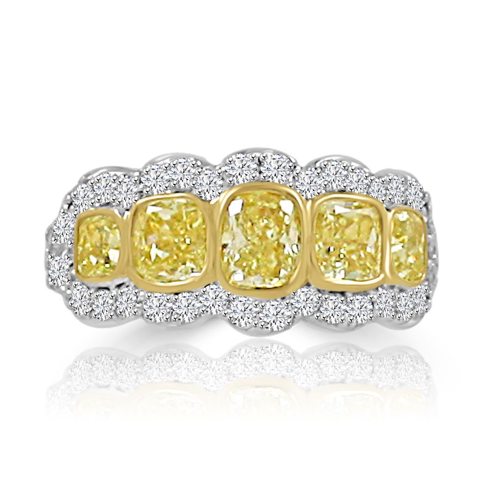 Yellow Cushion Shape Diamond Five Stone Ring surrounded with White Diamond melee with 2.53cts. Total diamond weight set in 18k gold