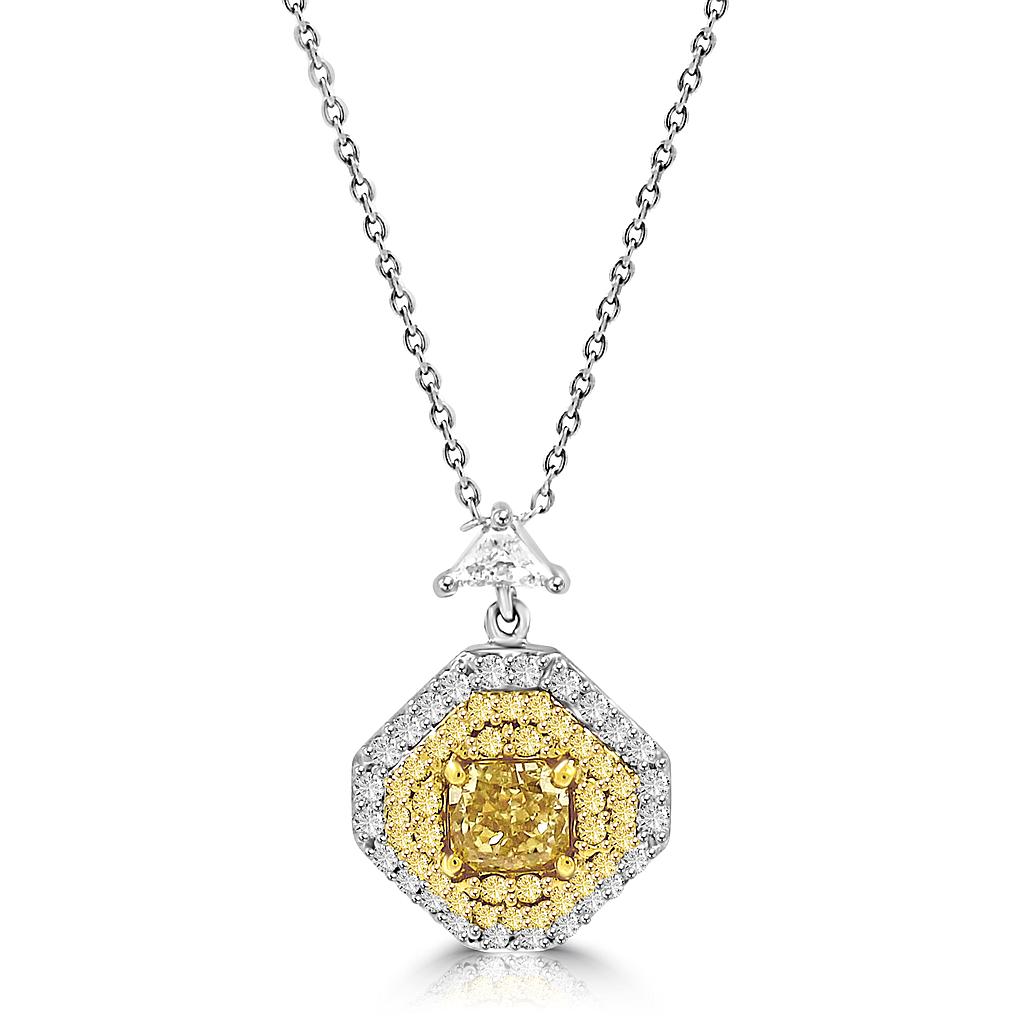 Yellow Diamond Octagon Pendant Necklace surrounded with Natural Yellow and White Diamond Melees and suspended on a Trillion Cut White Diamond with
